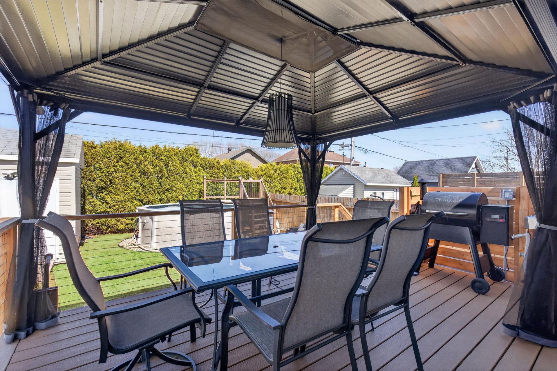 Inclus : Luminaires, habillages de fenêtres, lave-vaisselle, aspirateur central et accessoires, piscine et accessoires, gazebo, garage de toile, îlot de cuisine, thermopompe murale.